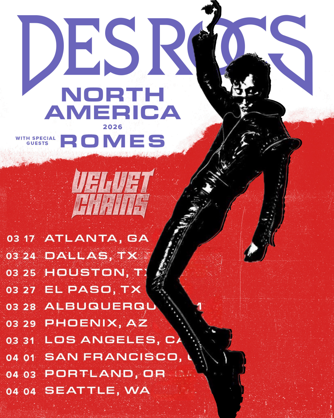 A banda também se prepara para cair na estrada como convidada especial da turnê norte-americana de Des Rocs. Ao lado de Romes, o Velvet Chains passará por cidades como Atlanta, Dallas, Los Angeles e Seattle entre março e abril, levando seu show energético para o público dos Estados Unidos.